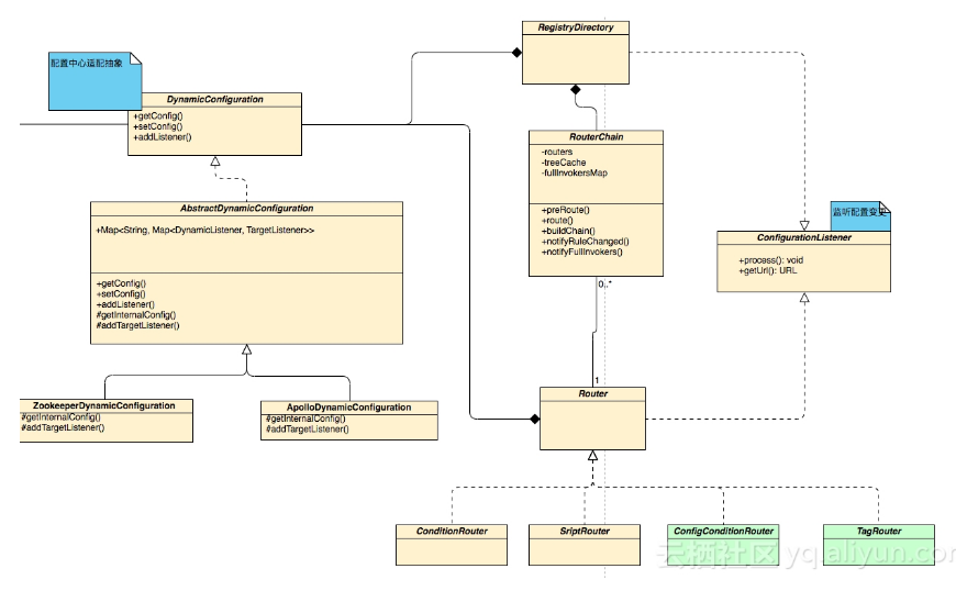 - Router,接收并解析路由规则,接收地址列表,根据路由规则完成过滤动作,并返回过滤后的地址列表。其本身也是一个ConfigurationListener,随时接收路由规则更新。