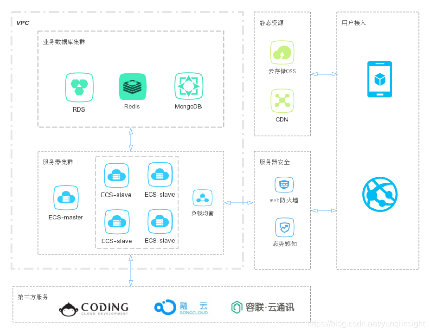 项目后端架构使用阿里云服务搭建,其中RDS为主从集群,并配备灾备实例。ECS可根据业务量动态弹性伸缩,其余服务均采用单实例的方式远程调用。