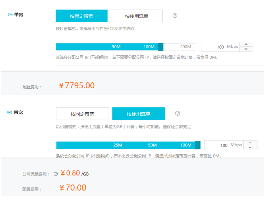 举个例子:同样一台ECS,在同为百兆带宽的情况下,每月的费用如下图: