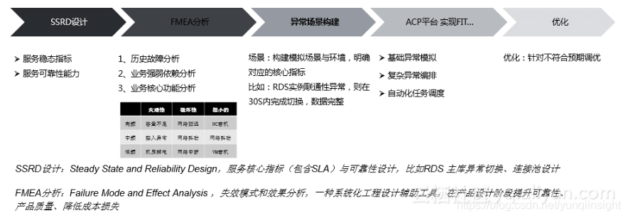 专有云有它的特殊性,故障在专有云的环境下往往影响更大,一个单一的故障在几百朵云内可能就是几百次故障.....更需要我们在产品设计过程中消除隐患,而这个过程可行方式之一就是启动SSRD设计,在产品构建之初启动可靠性设计并通过FMEA分析以及ACP不断挖掘潜在隐患并打磨故障处理的整个闭环,如下图:
