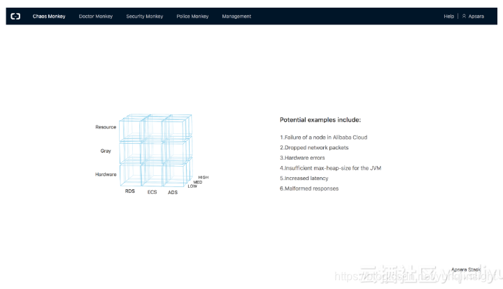 先跟大家聊聊业界是怎么多的?诸如Netflix探索通过异常注入的方式提升其视频服务的可靠性[1],已经演进成独立的“混沌自动化平台”(ChAP,Chaos Automation Platform);Microsoft Azure 在Netflix之后也研发了自己的异常注入平台;Google通过研发自动化平台来替代传统模型中的人工操作,在业务可靠性提升的重要方向都有对应的平台实现,参考《Site. Reliability. Engineering》;在阿里云已经有了Monkey King 平台,实现系统级别诸如宕机、磁盘掉盘、网卡丢包等异常注入。Netflix ChAP关注的是业务自身可靠性提升,不太适合专有云以及公共云这种模式;Google很多平台基于其强大的研发能力,在产品内部实现大量可靠性设计与代码嵌入,我们现在还比较难直接照搬;Monkey King已经能很好的实现异常注入的功能,但该注入哪些异常,该如何评估云产品的可靠性还在探索中。结合综上实践和思考,我们在业界经验的基础上,结合云特点正在探索通过混沌工程理念[2]提升系统可靠性。