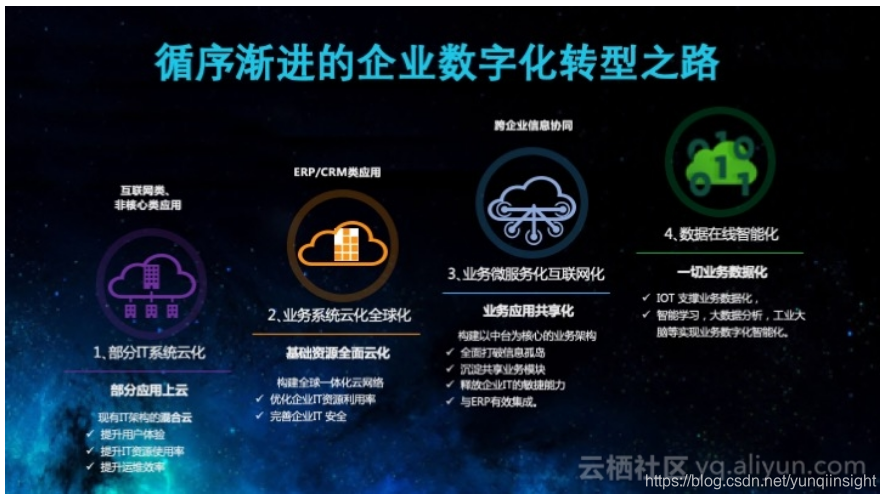 - 到了最后一个阶段,阿里云认为随着企业的业务在云上逐渐运行,收集了大量的一个数据,后面会通过智能学习、大数据分析相关的工具对数据进行智能化的一个分析,用于指导业务更精准的服务,更精准的开展。