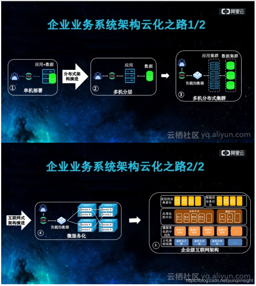 对应阿里云的系统架构转变,最开始的时候业务都是应用和数据一体化的单机部署方式,到后面应用和数据分层、多级分层部署,再到分布式的集群,以及到现在越来越应用广泛的微服务化的改造,在这个过程中可以看到应用和应用之间,应用和数据之间弹性越来越高。