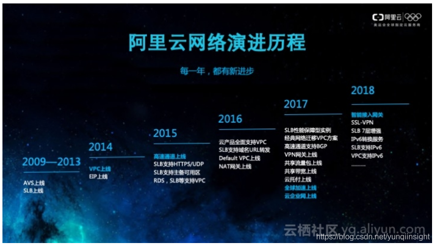 阿里云网络产品推进的时间点跟企业上云的系统基本上保持一致的。最开始只是提供AVS、SLB这些单实例,到后面因为基础实例上云了之后需要云上和云下的高速通道,专线以及智能接入网关,到后面资源的力度越来越细,分布的范围越来越广,阿里云提供了比如说全球加速、云企业网,通过企业架构在云上不停的演进,阿里云网络还将继续推进各种满足客户服务,各种业务系统的网络产品。