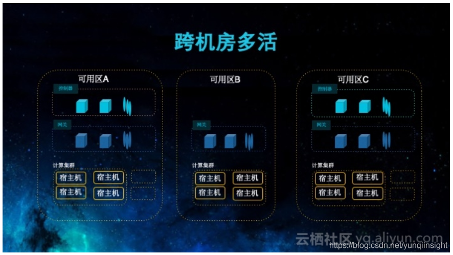 括控制器,包括各种网关,一方面是集群化部署,另外一方面在每一个机房基本上都会部署,节点与节点之间,机房与机房之间会互相备份,当某一个故障洛神会在集群内倒换,如果超过了一定的值会在机房倒换,避免因为单一的一个点或者一个集群故障造成整个网络的不可用。这个实际上是一个跨机房多活的方式。