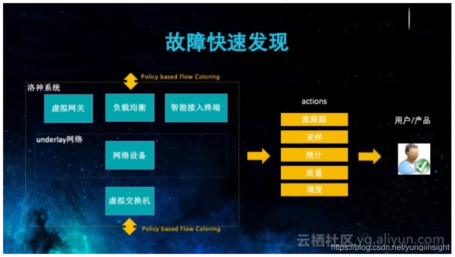 进行染色并且加以匹配,作用于阿里云虚拟网络和物理网络上面。在整个设备的运行过程中会对特定的业务,特定的流染色进行景象采样,打时间搓等等,会进行数据的实时分析。通过数据的实时分析快速发现特定的流的故障,比如说丢包了,立即通知网络管理人员恢复故障,这是我跟我们现在IT的思维基本上一致的,但是阿里云的洛神平台主要是从客户的业务出发。