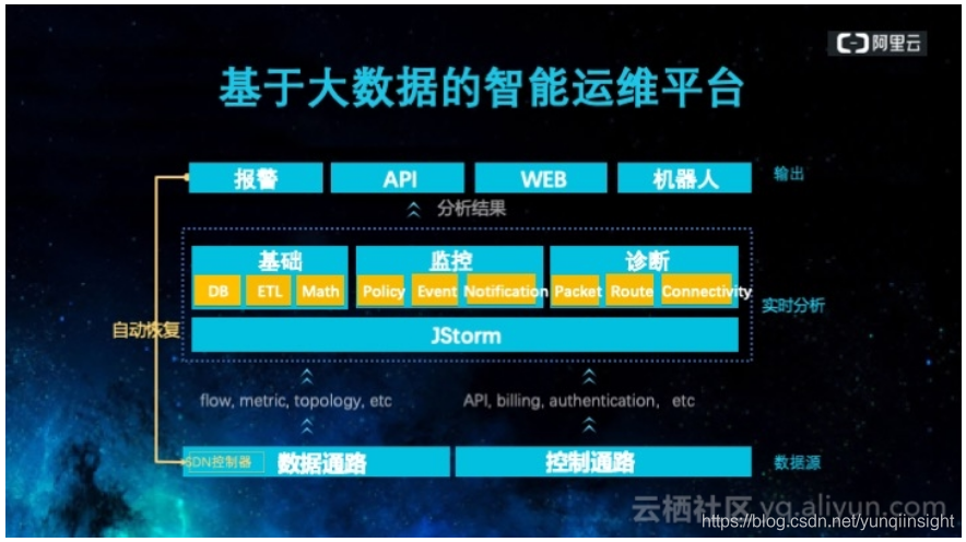 提到智能,就必须介绍阿里云基于大数据的智能运维平台,在阿里云内部叫齐天系统,通过数据面、控制面的各种数据收集,例如流数据、统计数据等等用户信息,收集到大数据的分析工具(JStorm)里面去对数据进行分类,我们分为基础数据、监控数据和诊断数据,对这些数据进行规则的匹配、运算,会将分析结果输送到各个界面,比如说报警、API、机器人等等,对于一些故障会进行故障隔离恢复,思路是差不多的。