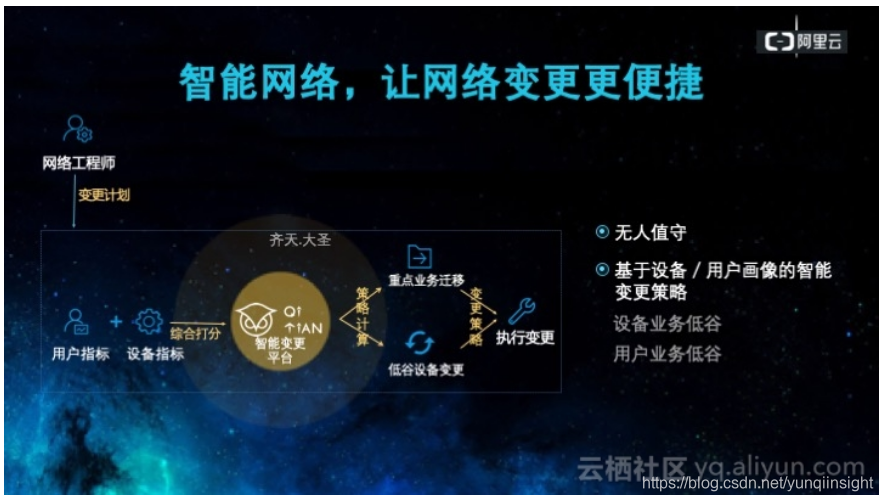 - 变更的案例:大家都知道线上很多的问题都是因为网络的变更导致的,怎么样降低变更时对业务的影响,阿里云一般会选取业务量最小的对客户影响最小的时间点去进行变更。那怎么选择时间点以往会通过人工的方式,这样的话一方面工作量大,另外一方面其实也不精准,对业务的影响是不可知的。阿里云的齐天平台可以通过大数据的分析,精准描绘用户网源的画像,选择业务量最小的时间点进行自动的变更。这样的话大大降低了影响业务运行的概率。另外很多时候要选择版本上线的时间进行恢复,很多的时候难以判断哪一些机房跟网源。利用大数据分析和齐天系统可以判断哪些先进行可以对业务的影响最小,这也是基于智能平台去做的,所以在网络变更的情况下可以达到对业务的影响很小,而且都是自动化完成的。