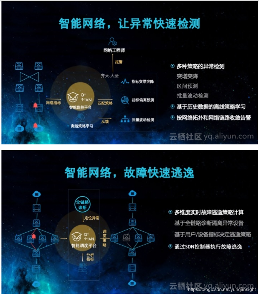 - 异常的检测:齐天会对多种策略异常检测,并且用到线上去,在实际的运行过程中判断这些策略是否异常存在并首先告警,其次会进行快速的逃逸过程。整个过程其实并不容易,因为要对全局全景进行判断,到底是屏蔽电路还是屏蔽结点还是整机房的倒换,要根据业务场景做综合判断才可以得出。实际上在阿里云的网络上运行时候正是齐天系统可以综合判断及决策,什么样的故障逃逸对业务的影响是最小的。
