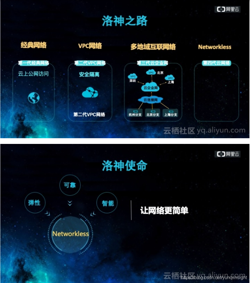 最后总结洛神的使命,洛神有三代,第一经典网络,主要是解决连通性的问题,第二代推出了VPC的网络用于安全隔离,当前是第三代,打通了接入云的解决方案,提供跟传统企业网络相同能力的能力,最后一个阶段阿里云定义为Networkless,最终的网络对最终用户其实是不可见的,就像阿里云网络的名称— 洛神,其实他像神一样你看不到他的存在,其实他也无处不在。
