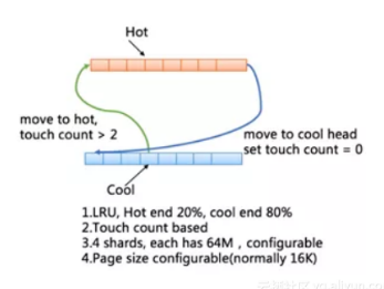 为了实现buffer I/O的能力,我们单独实现了page cache。Page cahce采用touch count based LRU算法实现。引入touch count的意义是为了更好的与数据库的I/O特性结合。因为数据库中时常会有大表扫描等行为,我们不希望这种使用频率低的数据页冲刷掉LRU的效率。我们会基于touch count将page在hot端和cool端进行移动。
