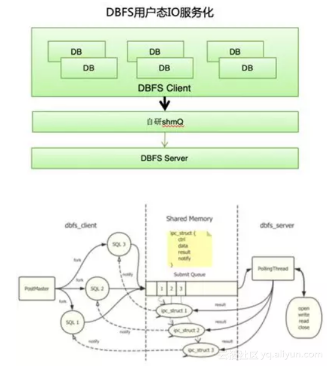 DBFS自研了shmQ组件,基于内享内存的IPC通信,从而拉通了对于PostgreSQL基于进程架构和MySQL基于线程架构的支持,使得DBFS更加的通用化和安全,为以后在线升级提供坚实的基础。