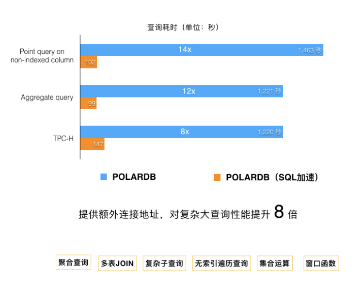 POLARDB为了应对这种场景,内置了并行查询引擎,针对大表复杂查询(比如TCP-H基准测试)性能可提升8倍,特别适用于执行时长超过1分钟的慢SQL(比如报表查询)。同时还支持了集合运算、WITH、窗口函数OVER等高级语法。该功能目前已经公测,免费使用,详细参考『SQL加速』。