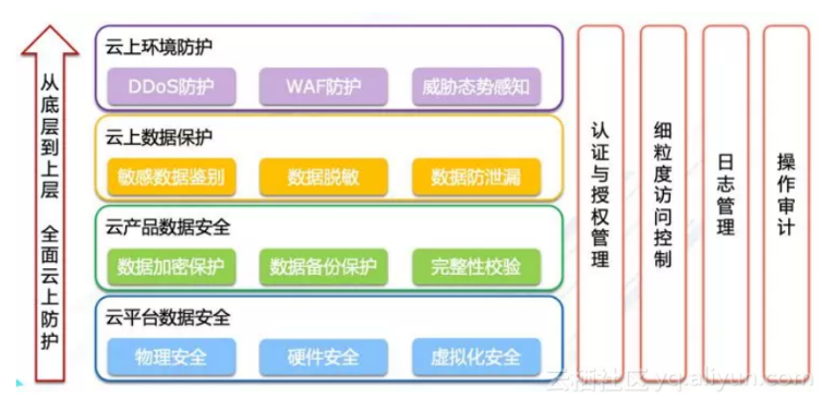 本方案的目标是为用户提供从底层云平台数据安全到上层的云上环境保护,并标明各层次模块,让用户可以像建房子一样,一层层的搭建可信的在云上数据的安全保护。在各横向层次模块之外,云上数据安全也需要纵向的认证、授权、访问控制和日志审计功能,从而为客户提供可控和合规的云上数据安全保护方案。