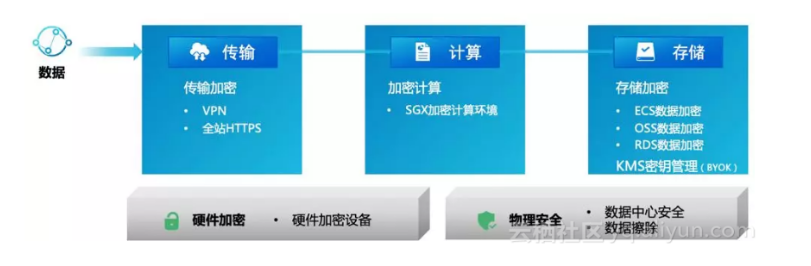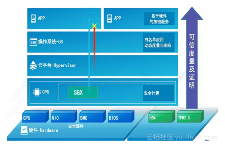 阿里云在云平台层面为客户提供默认高安全等级的基础设施能力,使客户可以放心的将数据存放和计算在可信的云平台上。值得特别指出的是,阿里云在云平台层面会对硬件和固件的安全进行加固和扫描,并使用TPM2.0技术来提供可信的度量和证明云平台底层的安全计算环境。同时阿里云具备基于硬件加密机(HSM)和芯片级别(SGX )的安全计算能力。