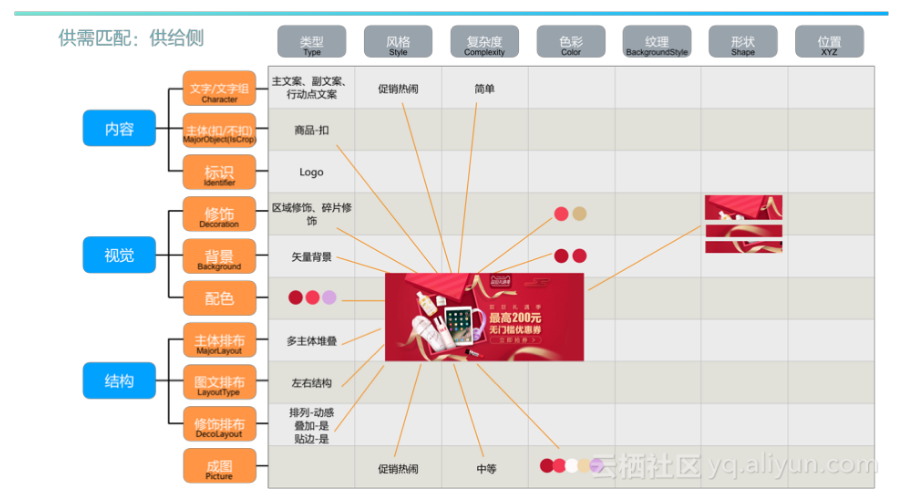 鹿班将各类成图设计,通过内容、视觉、结构几大维度进行标注和分析,建立对于构图、配色、搭配和文案几个方面在设计元素级别的认知。通过对千万套营销设计图片的全方位分析,建立了国内最大的营销类图片的知识图谱库。