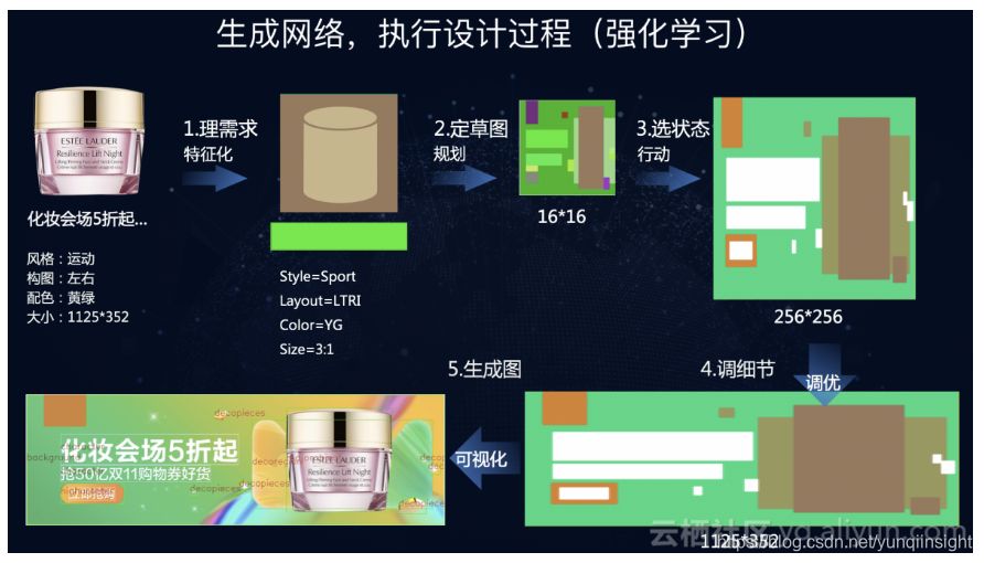 鹿班还建立了智设算法执行的流水线。将复杂多变的设计需求,抽象为需求特征提取、规划、行动、量化、合成可视化等过程。这套流程,目前应用于线上透明图Bannar设计、全画幅Bannar设计等应用场景。除了提高了业务迭代速度,同时也降低了算法模块之间的耦合性,降低了算法服务的运维成本。