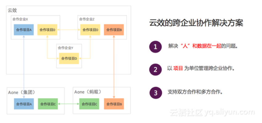 面对这种问题,云效首先解决人和数据在一起的问题,以项目为单位管理跨企业协作问题。通过建立以商业项目为维度的项目集,将各跨企业共享过来的子项目加入该项目集中;邀请各其他组织&团队干系人注册云效,并根据预先制定的权限范围将干系人加入各子项目中,防止项目数据泄露。