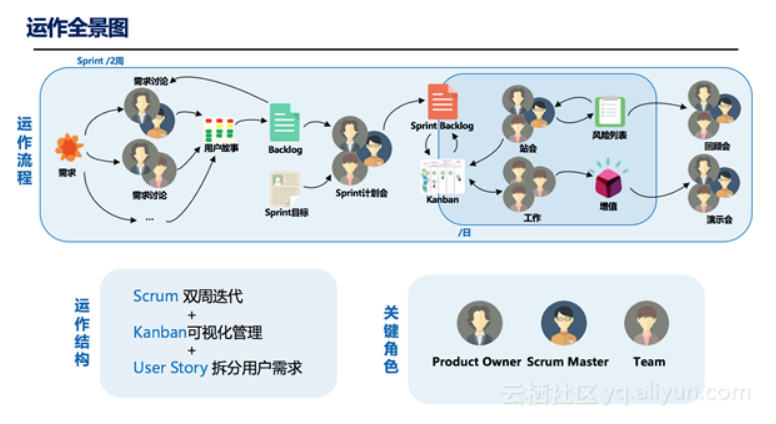 敏捷模式也是双11部分项目选择的模式,通过组建典型的Scrum团队组成ScrumMaster、Product Owner、团队成员三种角色,通过迭代规划会、电子看板、每日站会、迭代评审回顾会等解决方案,解决业务响应不及时、项目周期过长,实现实时交付。