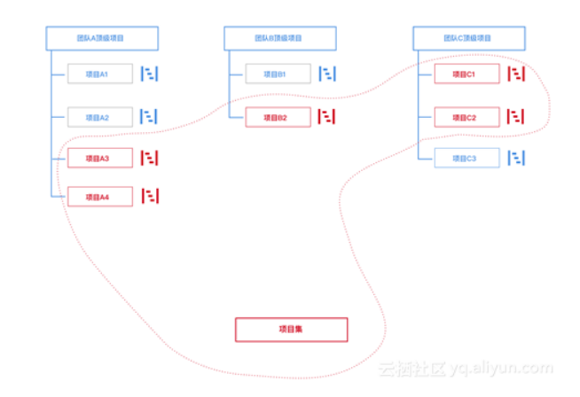双11项目组织是纵横交错,为了满足不同管理视角,云效用项目集来解决不同项目的集合管理。项目集包括一组相关联的的项目,这些项目之间进行相互协作,以达成共同的目标。一个项目可能属于某个项目集,也可能不属于任何一个项目集,但任何一个项目集中都一定包含项目。同时,项目集还可以有父项目集。