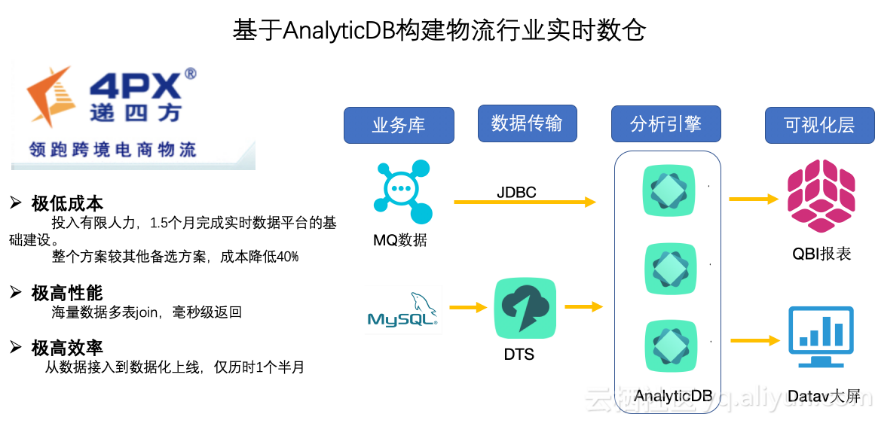 DTS+AnalyticDB+DataV/QuickBI套件,以简单快速的拖拽配置方式完成了4PX企业实时数仓的初期基础建设。