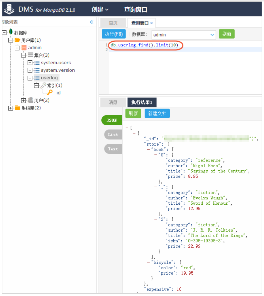 登录MongoDB的DMS控制台,本例中使用的数据库为 admin,集合为 userlog,您可以在查询窗口使用db.userlog.find().limit(10)命令查看已上传好的数据,如下图所示。