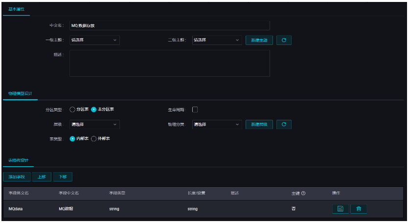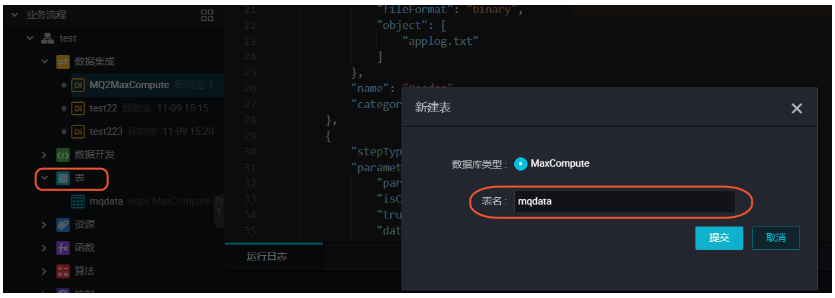 新建的同时,在DataWorks新建一个建表任务,用于存放JSON数据,本例中新建表名为mqdata。