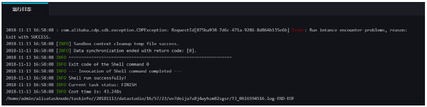 完成上述配置后,点击运行接即可。运行成功日志示例如下所示。{"type": "job","steps": [{"stepType": "mongodb","parameter": {"datasource": "mongodb_userlog",//数据源名称"column": [{"name": "store.bicycle.color", //JSON字段路径,本例中提取color值"type": "document.document.string" //本栏目的字段数需和name一致。假如您选取的JSON字段为一级字段,如本例中的expensive,则直接填写string即可。}],"collectionName //集合名称": "userlog"},"name": "Reader","category": "reader"},{"stepType": "odps","parameter": {"partition": "","isCompress": false,"truncate": true,"datasource": "odps_first","column": [//MaxCompute表列名 "mqdata"],"emptyAsNull": false,"table": "mqdata"},"name": "Writer","category": "writer"}],"version": "2.0","order": {"hops": [{"from": "Reader","to": "Writer"}]},"setting": {"errorLimit": {"record": ""},"speed": {"concurrent": 2,"throttle": false,"dmu": 1}} }