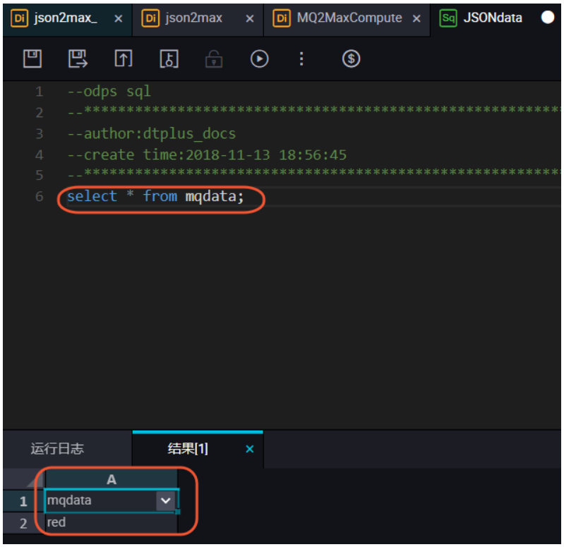 您可以输入 SELECT * from mqdata;语句,查看当前mqdata表中数据。当然这一步您也可以直接在MaxCompute客户端中输入命令运行。