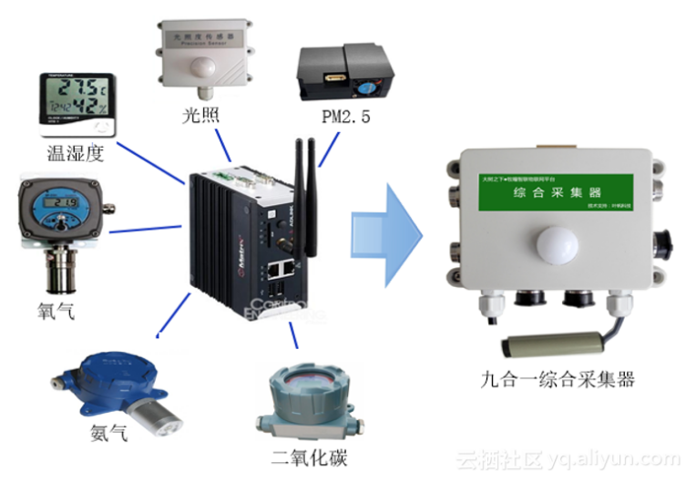二、右边是根据我们在现场实施过程中,根据遇到的各种情况,经过一系列的沉淀,研制出来的九合一综合采集器。经过多次完善才得来的,刚开始是三合一,后面是七合一,直到目前的九合一。它可把所有要采集的数据整合在一个设备上,然后很方便的直接上传到云端去,一是成本上大大降低,二是基本没有实施成本。