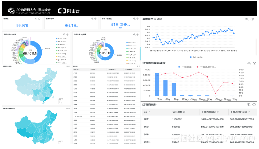 最终分析结果的展示也非常关键,CDN实时日志可以为用户提供基于业务的可视化报表服务,用户可轻松地掌控业务健康度、缓存命中率、平均下载速度、流量情况、网速、运营商、延时分布等数据。