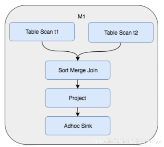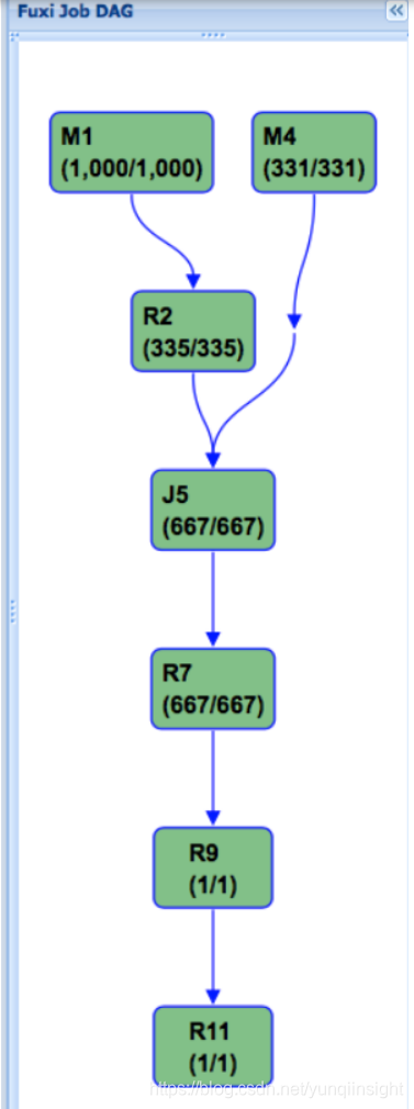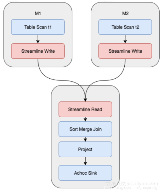于是,我们考虑,如果我们初始表数据生成时,按照Hash Shuffle和Sort的方式存储,那么后续查询中将避免对数据的再次Shuffle和Sort。这样做的好处是,虽然建表时付出了一次性的代价,却节省了将来可能产生的反复的Shuffle和Join。这时Join的Fuxi物理执行计划变成了如下所示,不仅节省了Shuffle和Sort的操作,并且查询从3个Stage变成了1个Stage完成: