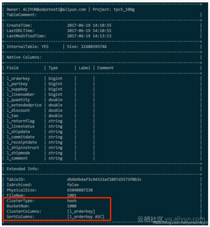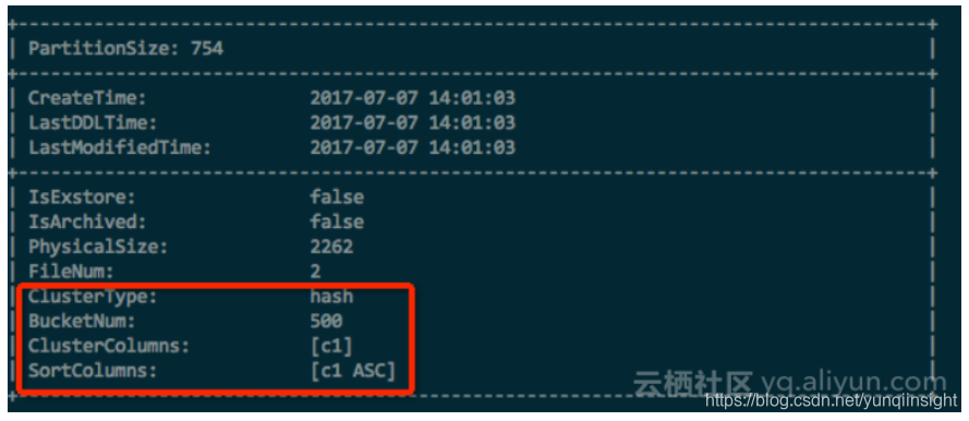 如果是分区表,则可以用这样的语句创建:CREATE TABLE T1 (a string, b string, c bigint) PARTITIONED BY (dt string) CLUSTERED BY (c) SORTED by (c) INTO 1024 BUCKETS;