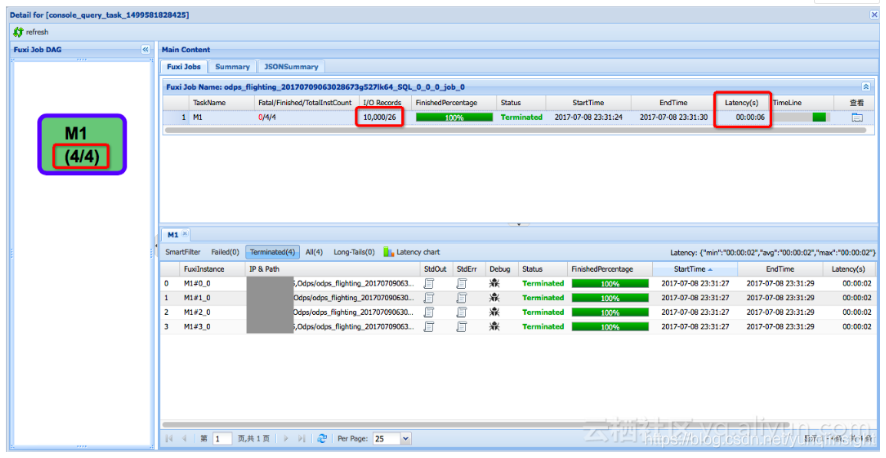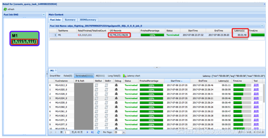 以下是安全部基于User ID查询场景的一个例子。下面这个logview是普通的表的查询操作,可以看到,由于数据量很大,一共起了1111个Mapper,读取了427亿条记录,最后找符合条件记录26条,总共耗时1分48秒:
