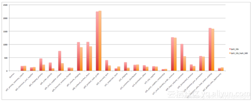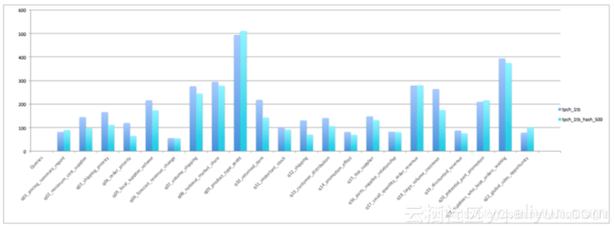 对于Hash Clustering整体带来的性能收益,我们通过标准的TPC-H测试集进行衡量。测试使用1T数据,统一使用500 Buckets,除了nation和region两个极小的表以外,其余所有表均按照第一个列作为Cluster和Sort Key。