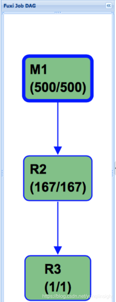 实际上对于MaxCompute今天的数据量和规模,我们绝大多数情况下都是使用的Sort Merge Join,但这其实是非常昂贵的操作。从上图可以看到,Shuffle的时候需要一次计算,并且中间结果需要落盘,后续Reducer读取的时候,又需要读取和排序的过程。对于M个Mapper和R个Reducer的场景,我们将产生M x R次的IO读取。对应的Fuxi物理执行计划如下所示,需要两个Mapper Stage,一个Join Stage,其中红色部分为Shuffle和Sort操作: