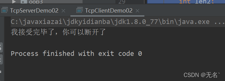 import java.net.Socket;public class TcpServerDemo02 {public static void main(String[] args) throws Exception {//1.创服务ServerSocket serverSocket = new ServerSocket(9000);//2.监听客户端连接Socket socket = serverSocket.accept();//阻塞式监听,一直等待客户端连接//3.获取输入流InputStream is = socket.getInputStream();//4.文件输出FileOutputStream fos = new FileOutputStream(new File("receive2.jpg"));//自动生成图片byte[] buffer = new byte[1024];int len;while((len=is.read(buffer))!=-1){fos.write(buffer,0,len);}//通知客户端我接受完毕了OutputStream os = socket.getOutputStream();os.write("我接受完毕了,你可以断开了".getBytes());//关闭资源fos.close();is.close();socket.close();serverSocket.close();}