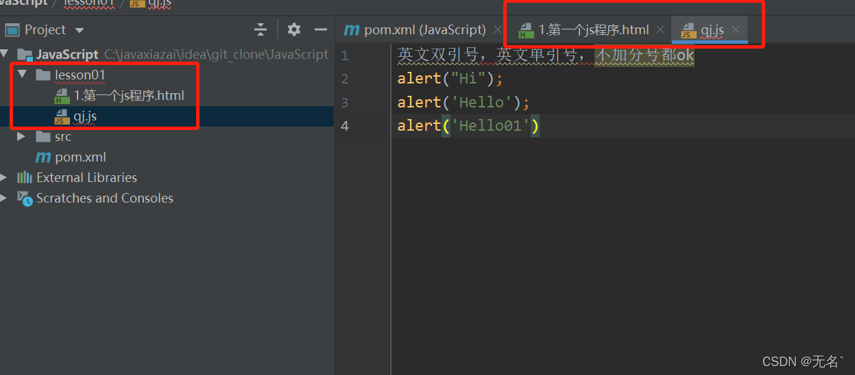 <!-- 外部引入,注意script标签必须成对出现--><script src="qj.js"></script>