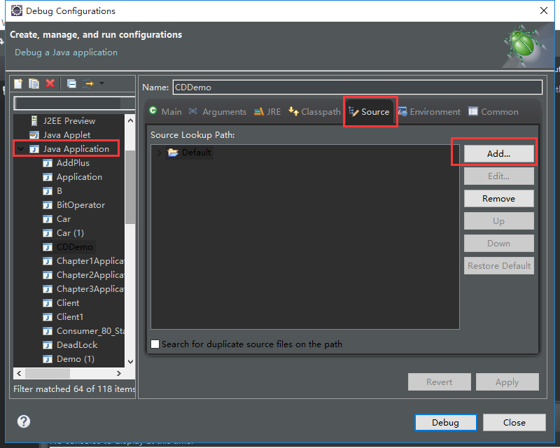 2、在Java Application下面选中需要debug的程序,然后点击source,点击add