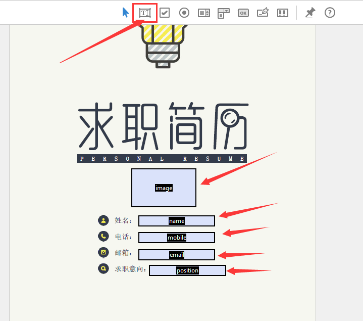 import com.itextpdf.text.pdf.PdfStamper;public class PDF {public static void main(String[] args) throws IOException, DocumentException {// 1、创建PDFReader对象PdfReader reader = new PdfReader("C:\\Users\\cc\\Desktop\\求职信模板.pdf");// 模板文件的路径// 2、创建输出流对象FileOutputStream fos = new FileOutputStream("C:\\Users\\cc\\Desktop\\我的求职信.pdf");// 最后输出文件的路径// 3、创建印章对象PdfStamper ps = new PdfStamper(reader, fos);// 4、获取PDF表单AcroFields fields = ps.getAcroFields();// 5、设置支持中文BaseFont bfChinese = BaseFont.createFont("STSongStd-Light", "UniGB-UCS2-H", false);fields.addSubstitutionFont(bfChinese);// 6、数据填充(没有图片的话下面可以省略)List<FieldPosition> signature = fields.getFieldPositions("image");for (int i = 0; i < signature.size(); i++) {Image img = Image.getInstance("C:\\Users\\cc\\Desktop\\1.png");float x = signature.get(i).position.getLeft();float y = signature.get(i).position.getBottom();float width = signature.get(i).position.getWidth();float height = signature.get(i).position.getHeight();img.setAlignment(Image.DEFAULT);// 设置对齐位置img.setAbsolutePosition(x, y);// 设置坐标位置img.scaleAbsolute(width, height);// 设置图片大小:宽200,高90// img.scalePercent(5);//设置图片百分比PdfContentByte contentByte = ps.getOverContent(signature.get(i).page);contentByte.addImage(img);// 添加图片}fields.setField("name", "张三");fields.setField("mobile", "17017511125");fields.setField("email", "1658633515@qq.com");fields.setField("position", "Java开发工程师");ps.setFormFlattening(true);// 7、流关闭ps.close();fos.close();}}