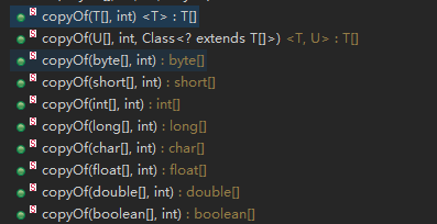我们这里看到copyOf方法有很多重载的方法,这里我只看public static <T,U> T[] copyOf(U[] original, int newLength, Class<? extends T[]> newType),因为其他方法同这个方法类似。