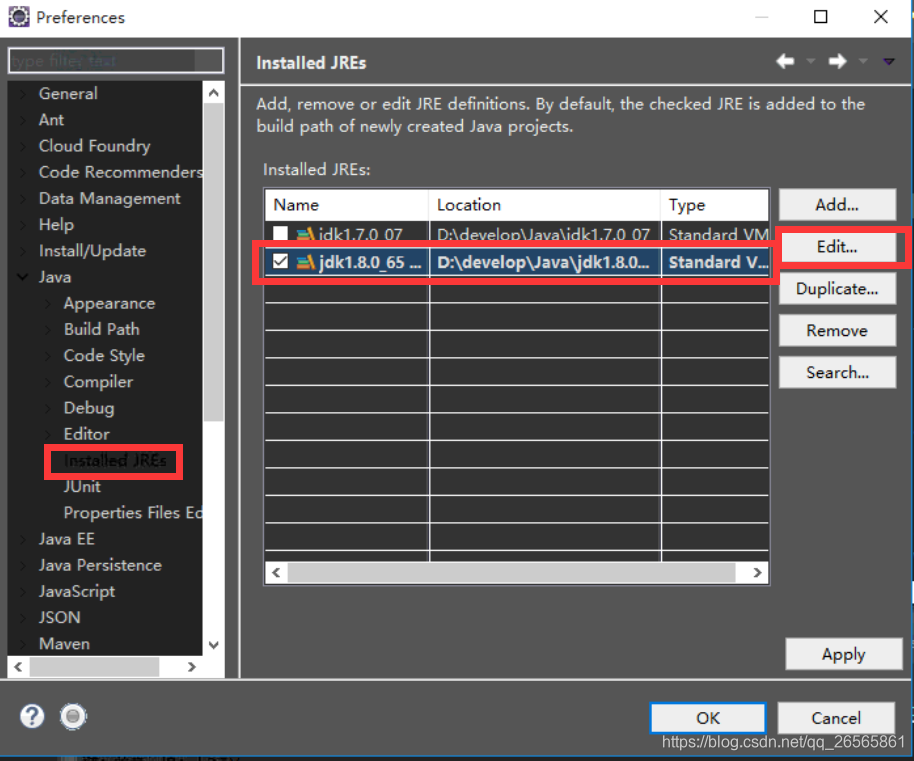 window>preferences>JAVA>installed jres>选中当前的jre(我这里是1.8.0_65)>edit