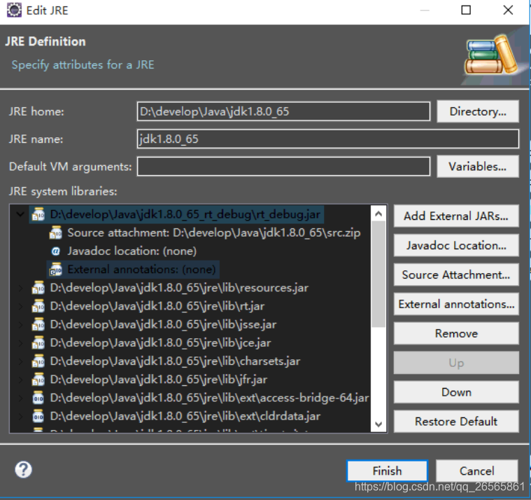 点击edit之后弹出新窗口,点开rt_debug.jar,然后我们发现source attachment为none,需要配置一下,选中source attachment,点击右侧的source attachment然后链接到jdk的源码文件src.zip