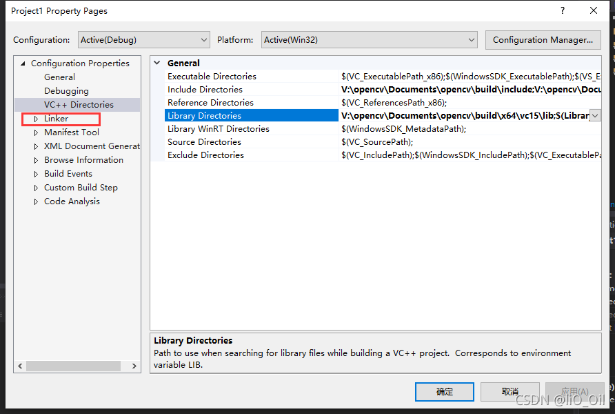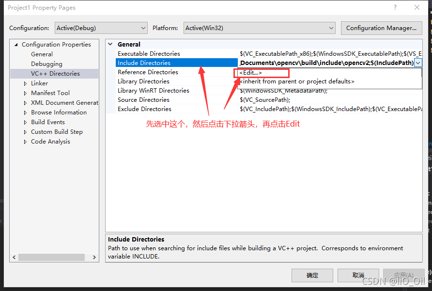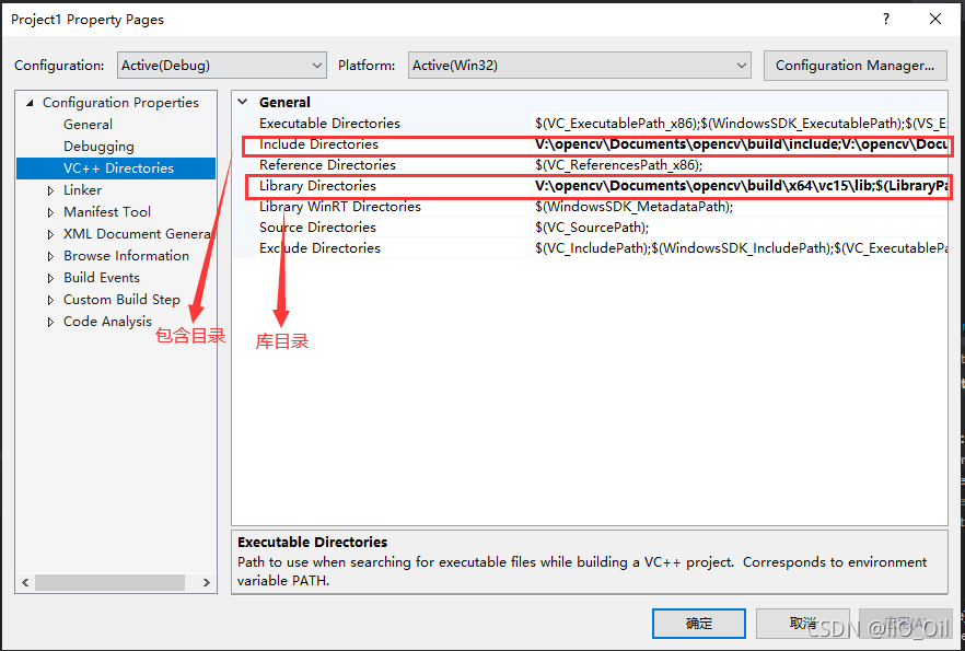 项目->属性->VC++目录,之后将会在右侧显示“包含目录”和“库目录”。
