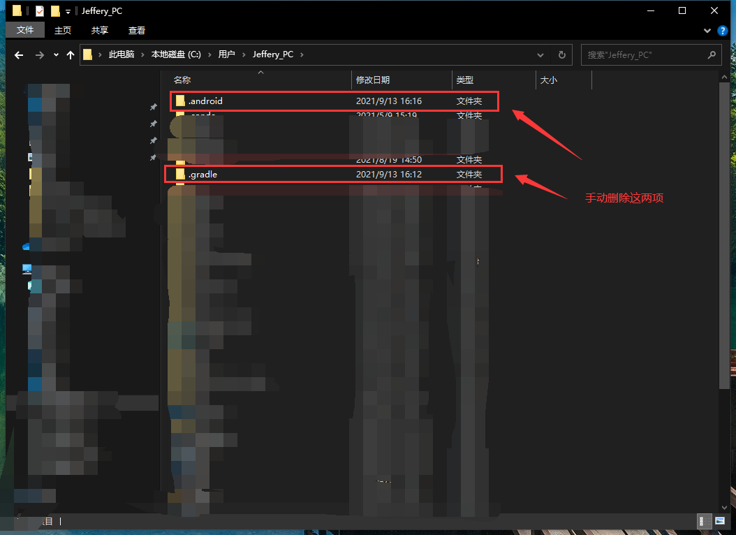 A、去系统盘C:\Users\用户名(用户名写你自己的)中,删除“.Android”以及“.gradle"等目录。
