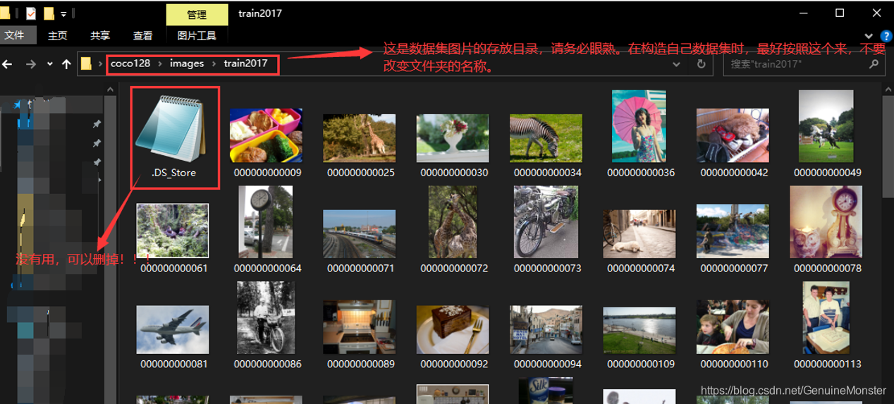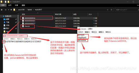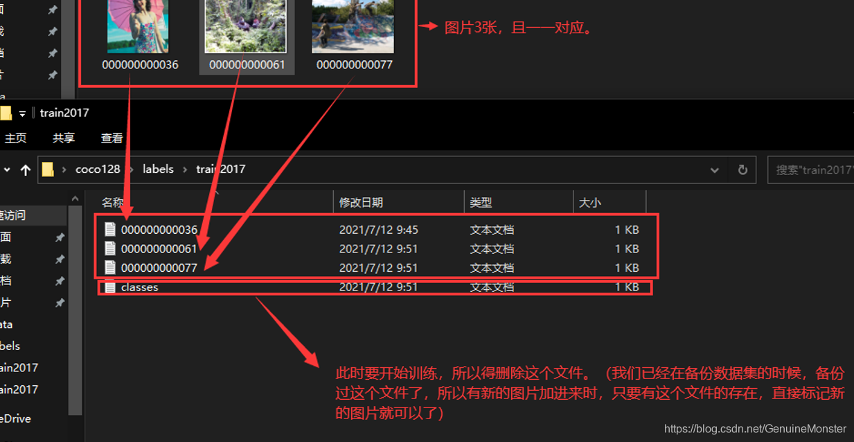 即:coco128\images\train2017目录下的图片数量和coco128\labels\train2017目下的txt文件数量一致(确保classes.txt文件已被移除)。补充说明如下图所示: