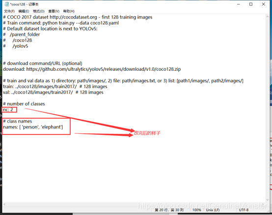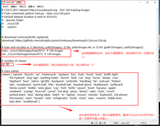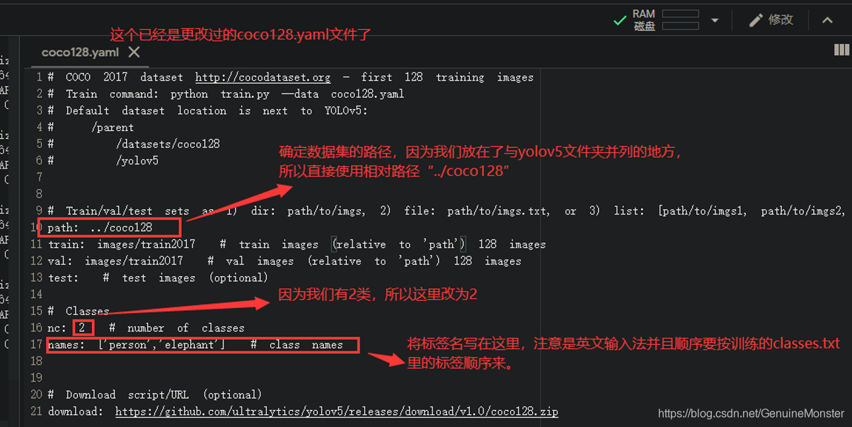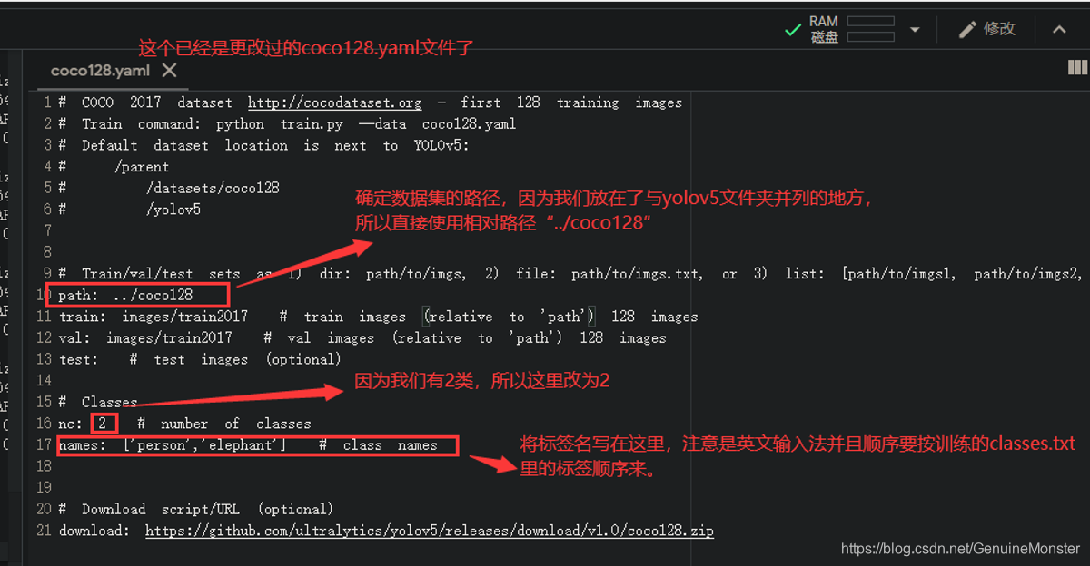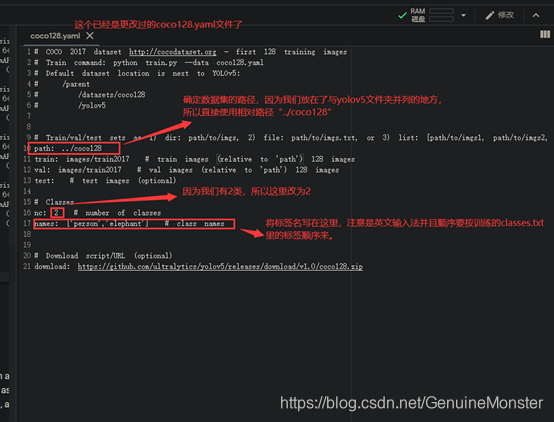 这里需要注意,貌似新的coco128.yaml文件是以下样子(多出了“path”,就是下图中第一个红框内容,需要按照图片中的内容来修改相对路径):