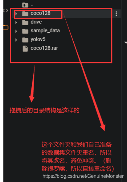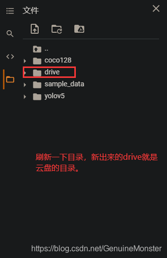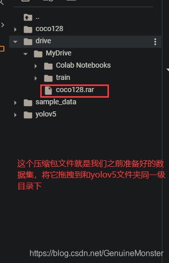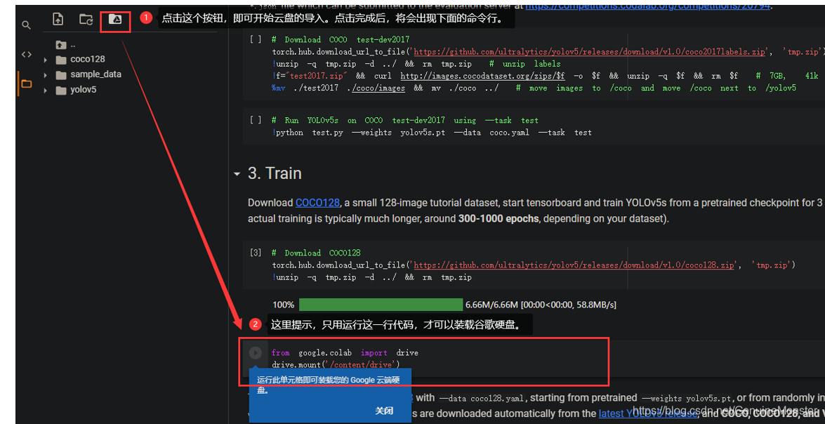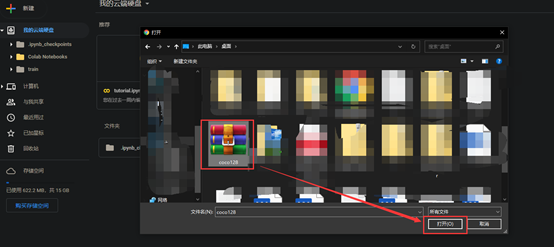 因为从Colab上传文件时较慢(我个人情况是这样的,你们可以试试,快的话直接上传就好),所以,我先将coco128上传到谷歌云盘,再转移到笔记本目录。具体操作见下图: