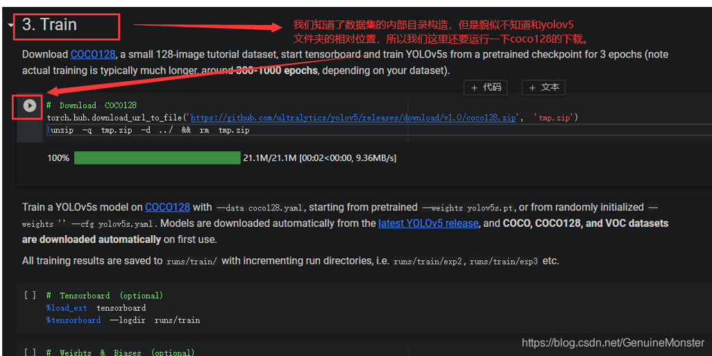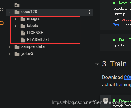 我们知道了coco128文件夹内的目录结构,但是还不知道coco128文件夹和YOLOv5文件夹的目录关系(其实在第二章的2中,进行本地预训练时,留心的同学已经知道解压后的coco128文件夹和YOLOv5文件夹是并列的关系,但此处再罗嗦一下)所以,接下来直接滑动滚轮到Train条目下。操作如图所示: