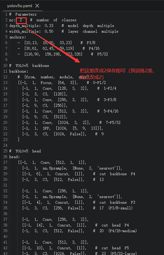 别忘记Ctrl + s保存。保存后,关闭coco128.yaml文件即可。最后,还得去改一项内容,就是对应权重的yaml文件。(我在训练时引入了--cfg选项)